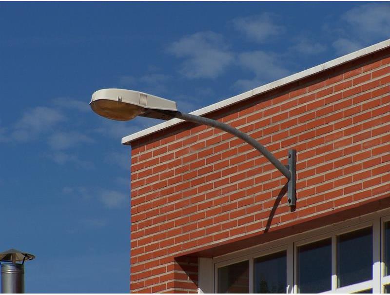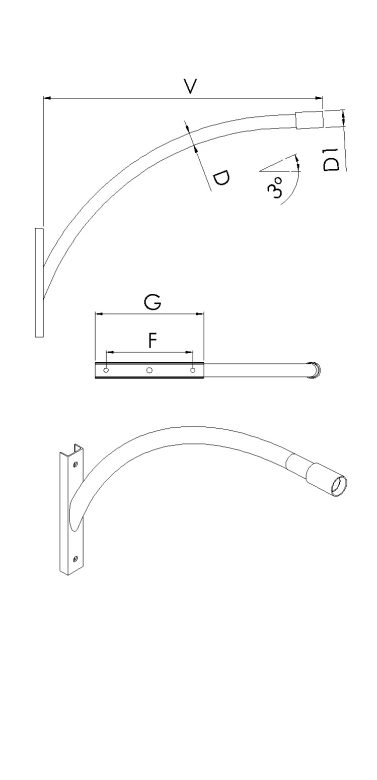 | Brazo mural de dimensiones según tabla adjunta. Fabricado con tubo curvado de acero al carbono S-235-JR, placa de fijación de perfil de acero al carbono laminado en caliente y cartela de refuerzo. |