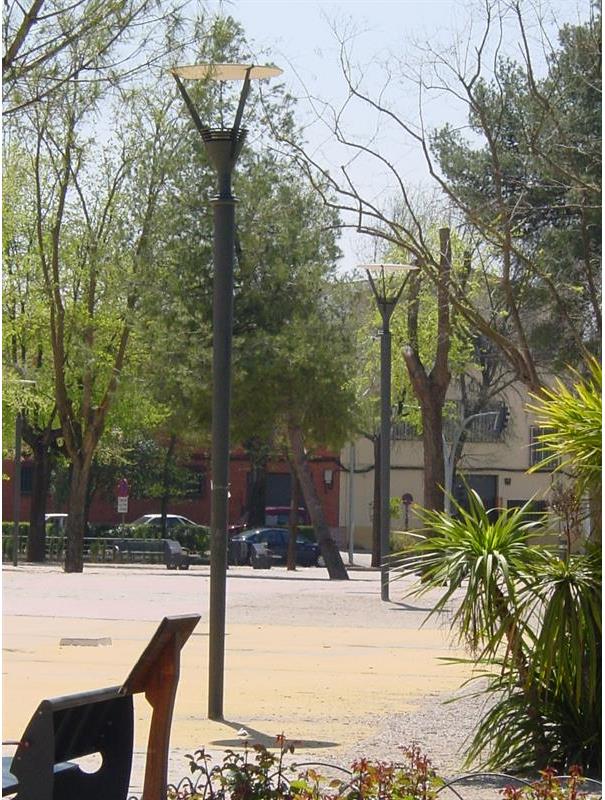 | Columna troncocónica invertida de altura y diámetro en punta, según tabla adjunta. Fabricada en chapa de acero al carbono, conicidad 12‰. Provista de puerta de registro enrasada, pletina para fijación de caja de conexiones, puesta a tierra, placa de anclaje plana, aro de refuerzo y cartelas. |